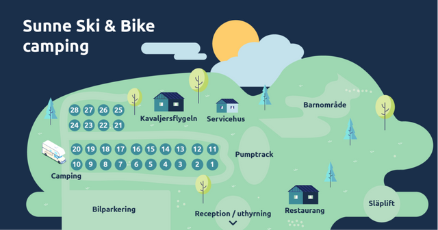 Servicehuset är utrustat med duschar, toaletter, tvättmöjligheter och kök för matlagning. För extra njutning finns även bastu att hyra – perfekt efter en dag i backen eller på cykelleden.
